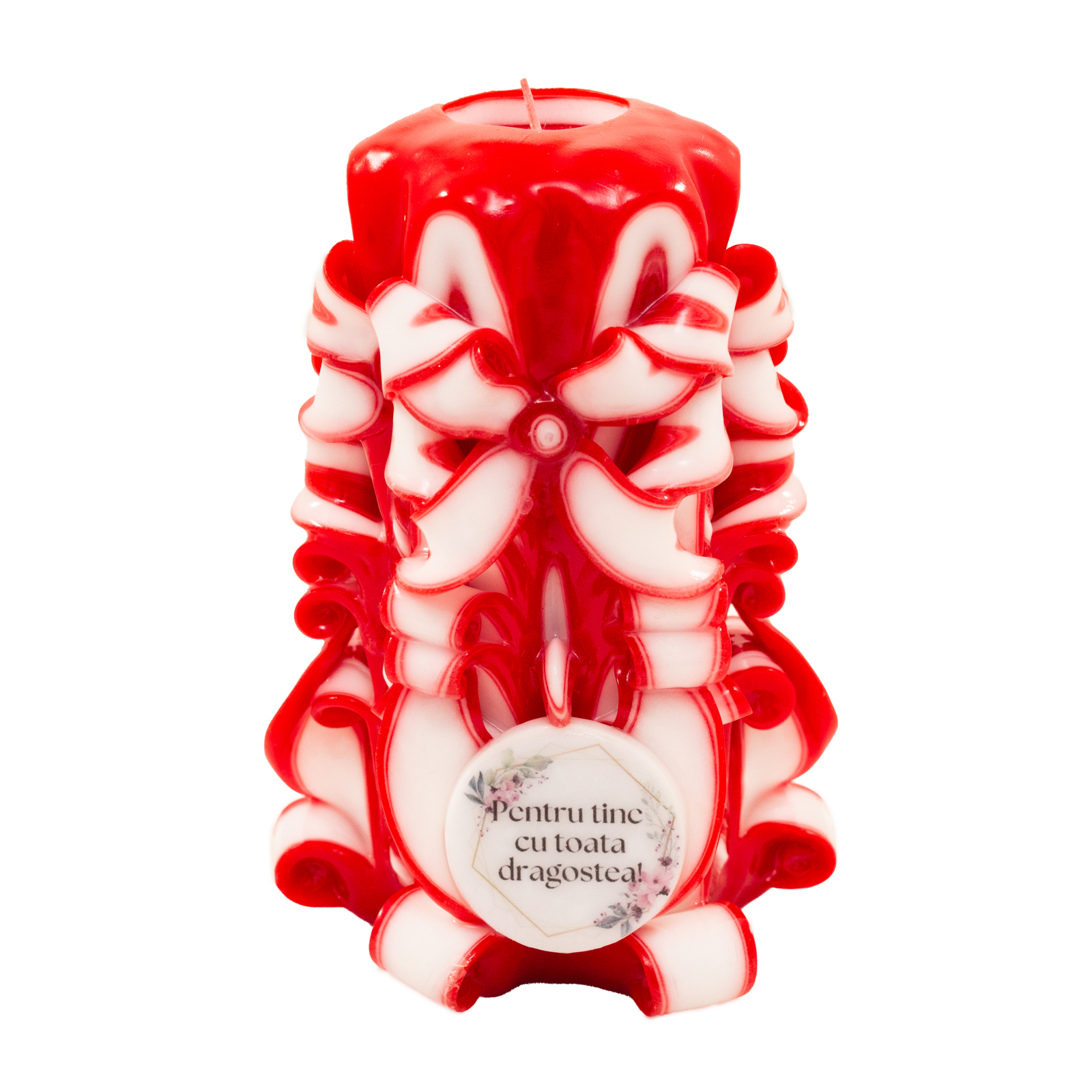 Aceasta lumanare sculptata manual imbina armonios nuantele de alb si rosu, evocand frumusetea iubirii si prospetimea primaverii. Designul sau rafinat, cu linii fluide si detalii atent lucrate, creeaza o piesa decorativa deosebita, ideala pentru a aduce caldura si emotie in orice spatiu.