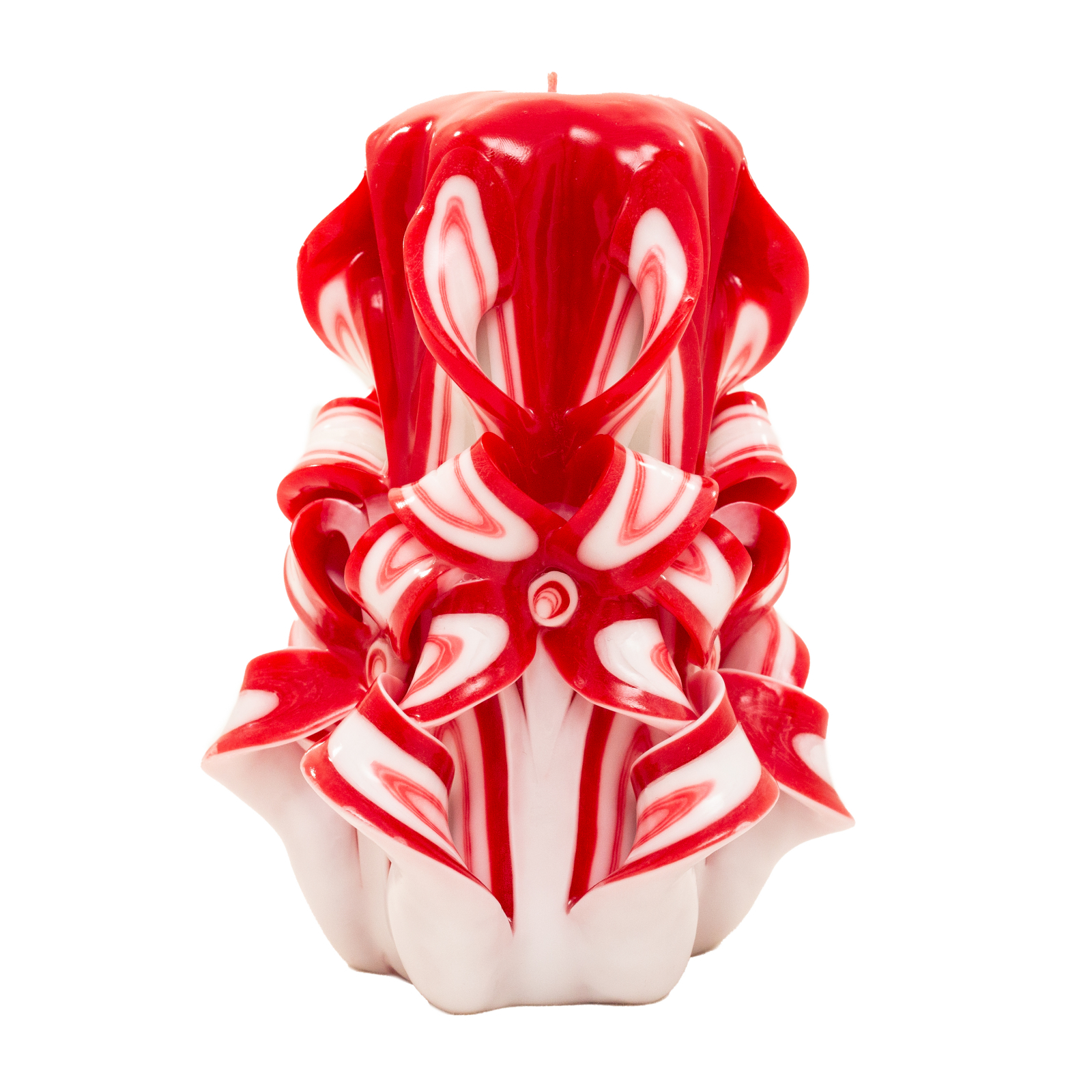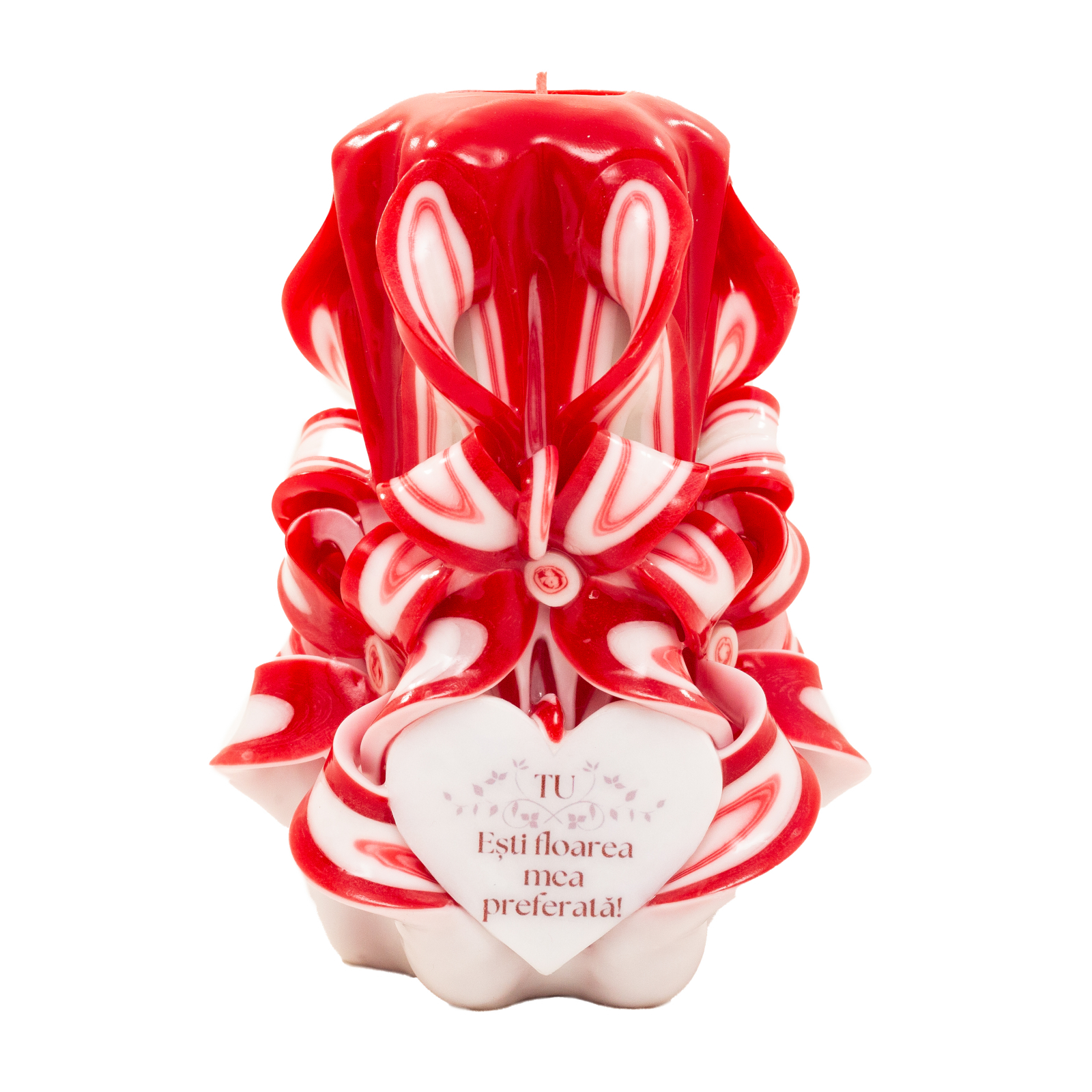 Aceasta lumanare unica nu este doar un obiect decorativ, ci o expresie a rafinamentului si a sentimentelor profunde. Rosul vibrant simbolizeaza pasiunea, iar albul delicat transmite puritate si armonie, creand un contrast deosebit ce atrage privirea.