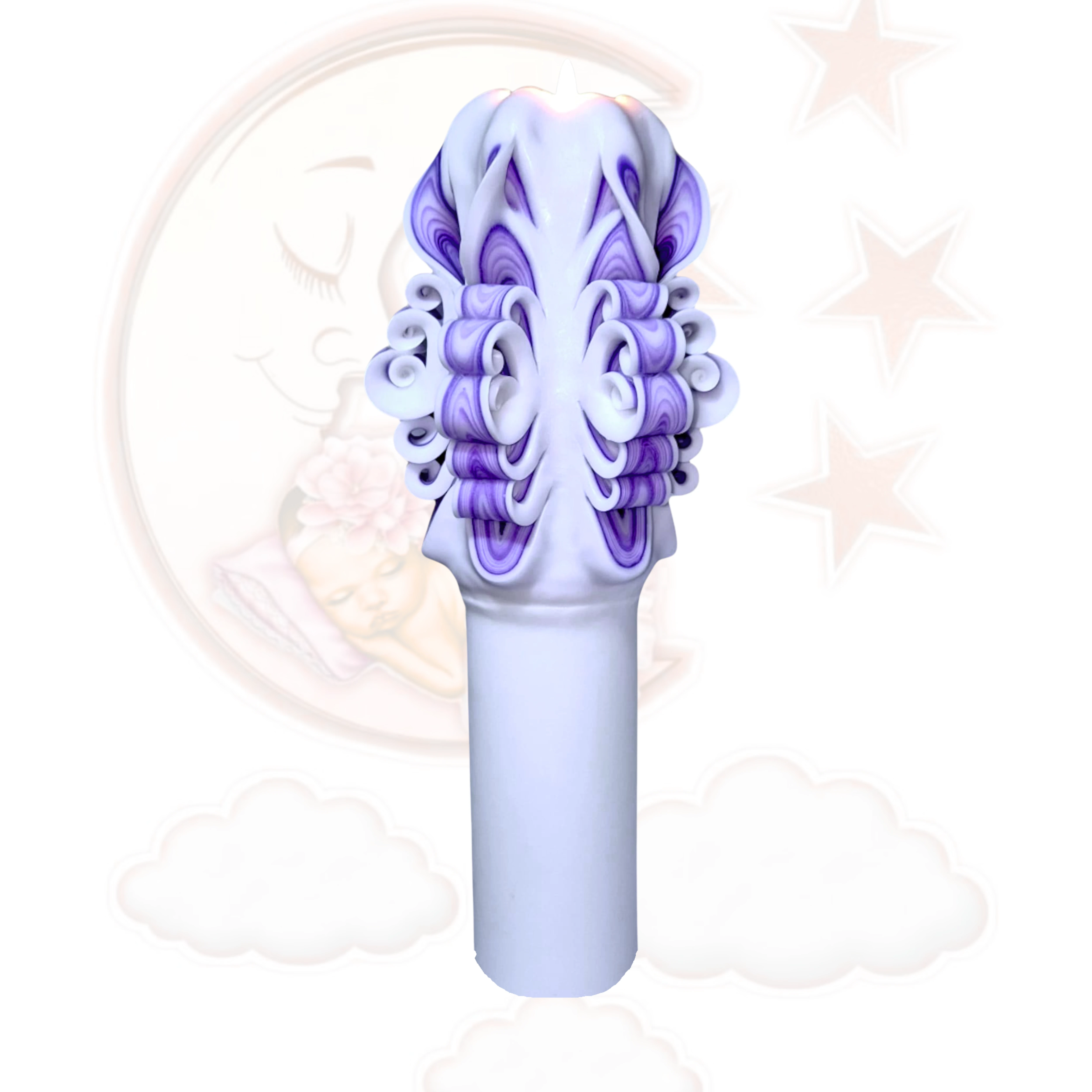 Confecționată prin scufundări succesive în straturi de alb și mov, lumânarea capătă profunzime cromatică și o personalitate vizuală aparte. Această compoziție evocă puritatea, renașterea și protecția, fiind alegerea perfectă pentru un botez plin de emoție și semnificație.