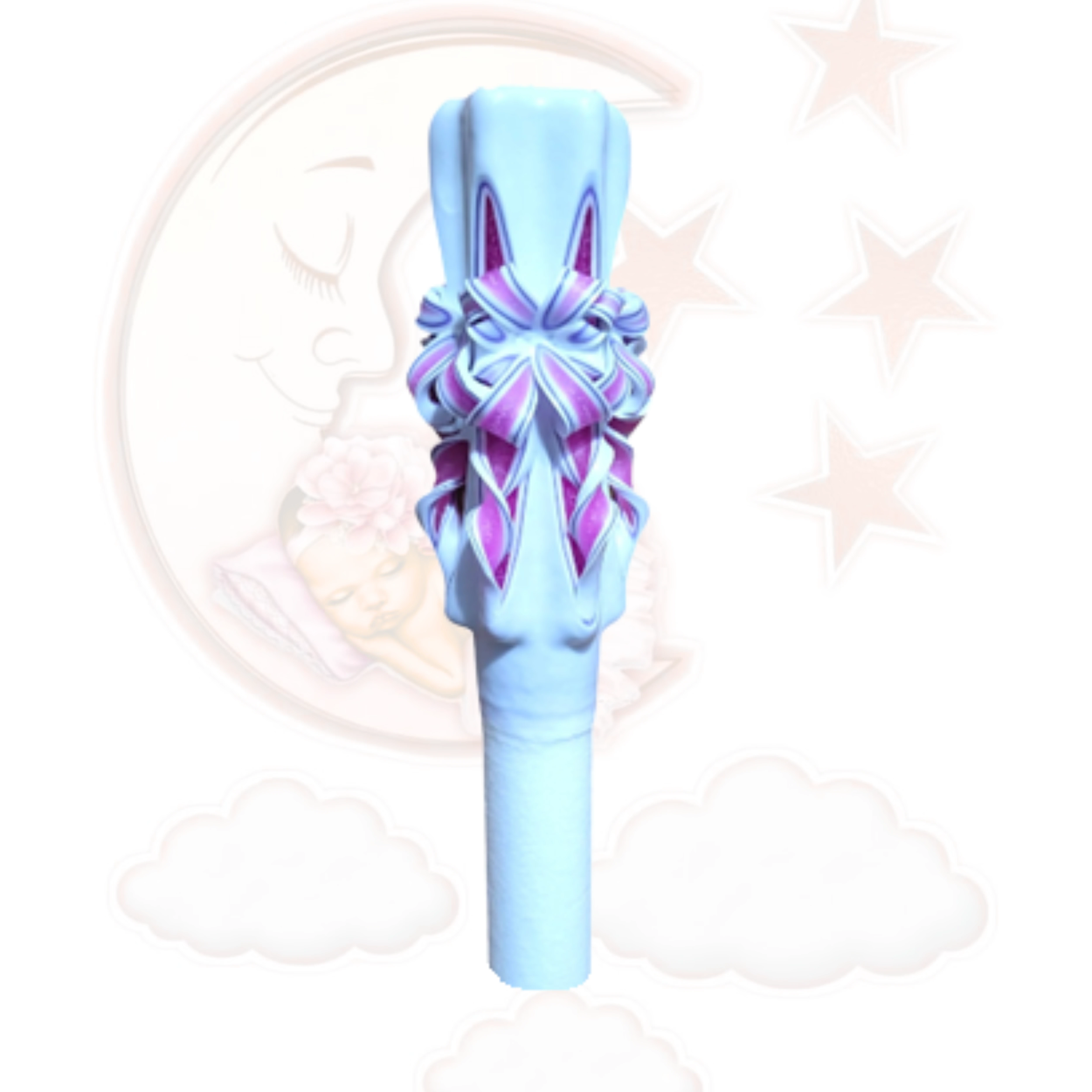 Această lumânare sculptată manual este concepută special pentru ceremonia de botez, simbolizând începutul unui drum comun și lumina momentelor importante din viața copilului tău. Este realizată cu atenție la detalii și aduce o notă de rafinament și semnificație fiecărui eveniment.